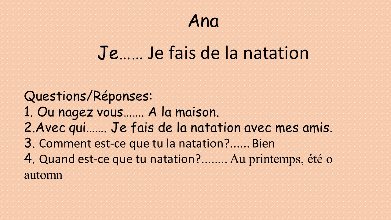 Recently, students shared a hobby or pastime in French on a shared PowerPoint, then their classmates asked them questions about it. Students answered the questions, then we played a trivia game where I asked the class questions about a student's hobby and the students had to figure out what the answer was by looking at their slide. Here are some of the completed slides: